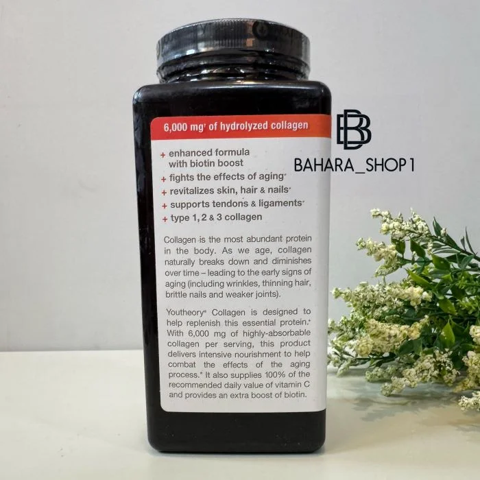 مکمل کلاژن برند  Youtheory در هر وعده غذایی مقدار6000  میلی گرم کلاژن هیدرولیز شده و 90 میلی گرم ویتامین  Cرا وارد بدن می کند. فرمولاسیون پیشرفته و هیدرولیز شده ی کلاژن که حاوی 18 اسید آمینه است، به راحتی هضم شده و به سرعت در بدن جذب می شود و کلاژن بدن را مجددا بازسازی می کند. پپتید های کلاژن به همراه ویتامین  Cبه احیا و تقویت پوست، مو، ناخن، تاندون ها و رباط ها و  … کمک کرده و با اثرات پیری مبارزه می کند. قرص کلاژن یوتئوری فاقد لبنیات، سویا و گلوتن می باشد.
